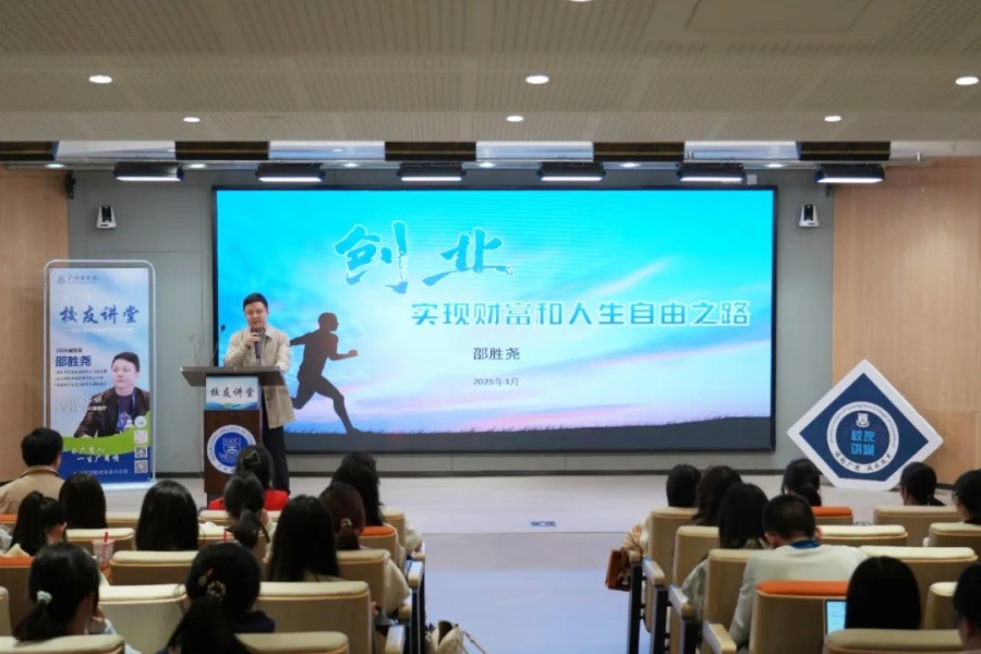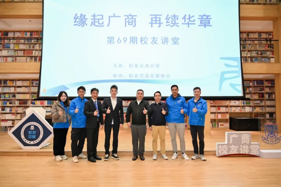 人生不停,创业不止,逐梦不休,拓业无休。3月13日下午,第70期校友讲堂在八教202报告厅成功举行,邀请2018届校友、寰球企业家俱乐部创始人(之一)及资源对接平台鹏友圈创始人潘展鹏回到母校,分享自身创业经验,引导广商学子更好地就业创业。学校校友会执行会长、校友办主任、品牌宣传部部长翁楚歆副教授,校友办全体老师以及各学院师生代表线上线下550余人参加本次活动。