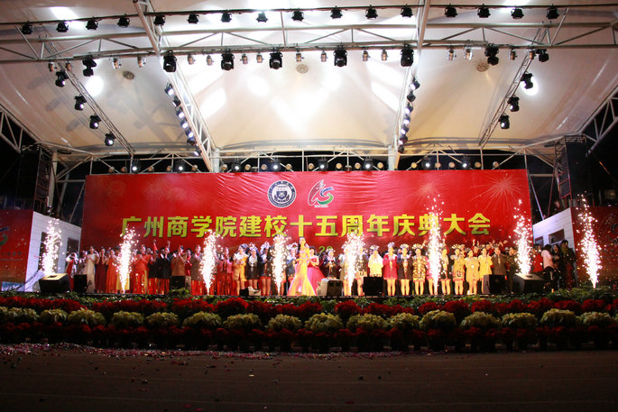 12月28日晚,由广州商学院团委、学生会主办的广州商学院建校十五周年文艺晚会在田径场舞台隆重举行,广东省教育厅、华南师范大学、广州开发区(萝岗区)、兄弟院校、合作单位等各级领导以及郭冬冬董事长、执行董事郭小娜等董事会领导、院长杨文轩教授等学院领导、各届校友、学院师生等出席了晚会。几千名师生校友齐聚晚会现场,共贺广州商学院十五周年华诞。