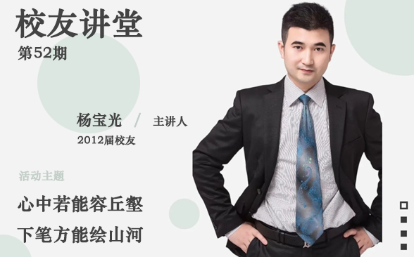 校友会将于2024年5月23日(星期四)18:20,在第八教204教室教室举办第50期校友讲堂,邀请2012届校友杨宝光进行《心中若能容丘壑,下笔方能绘山河》主题分享