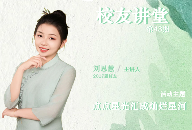 为了进一步加强校友与在校生之间的互动交流,发挥校友的榜样作用,激励在校生见贤思齐,汲取力量,校友办特此举办校友讲堂活动,邀请优秀校友分享自身奋斗历程,引导广商学子更好地就业与创业,校友会将于2024年4月11日(星期四)18:20,在第八教204教室教室举办第42期校友讲堂,邀请2017届校友刘思慧以《 点点星光汇成灿烂星河》为主题,从个人成长经历,升学、就业规划,教师求职指引与职业发展和自我提升几方面进行分享。