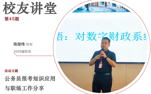 为了进一步加强校友与在校生之间的互动交流,发挥校友的榜样作用,激励在校生见贤思齐,汲取力量,校友办特此举办校友讲堂活动,邀请优秀校友分享自身奋斗历程,引导广商学子更好地就业与创业,校友会将于2024年4月18日(星期四)18:20,在第八教204教室教室举办第45期校友讲堂,邀请2008届校友陈楚伟进行公务员报考知识应用与职场工作分享。
