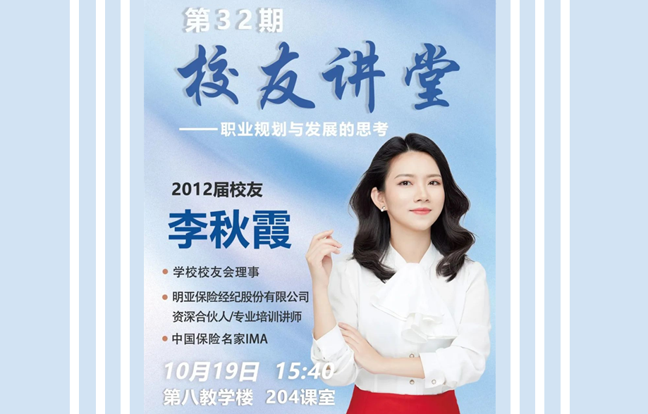 广州商学院校友会将于2023年10月19日(星期四)15:50在八教204报告厅举行第32期校友讲堂,邀请2012届校友李秋霞以“”工作11年再回首,职业规划与发展的思考”为主题分享自己的经历与感悟。届时,广州商学院校友会抖音直播间将同步进行直播,敬请留意。